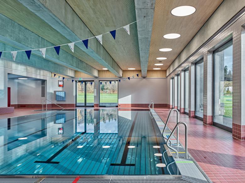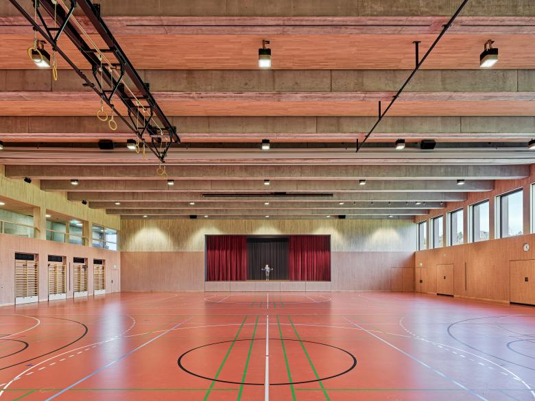 Mit dem Neubau einer Mehrzweckhalle mit Bühne und einem Lehrschwimmbad soll nicht nur dem zukünftigen Bedarf entsprochen werden, sondern auch die städtebauliche Situation des heterogenen Schulcampus geklärt und aufgewertet werden. Die neue Mehrzweckhalle schließt die Schulanlage gegen Nordosten ab und spannt gleichzeitig einen neuen zentralen Pausenplatz im Zentrum des Schulareals auf. Durch die städtebauliche Konzentration der Sportstätten und punktuelle Umstrukturierungen im Bestand entstehen Synergien mit der bestehenden Dreifachturnhalle sowie optimale Betriebsabläufe für Schule, Vereine und Veranstaltungen.