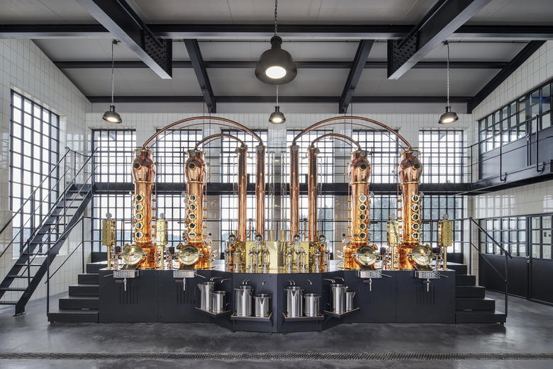 Featuring the materials copper, brass and stainless steel, the 150 sqm distillery building with extra high ceilings houses the core of the Monkey 47 Black Forest Distillery: a custom designed distillery boiler built by the German copper smith Arnold Holstein. Large steel windows provide ample daylight and a great view into the valley and the surrounding landscape.