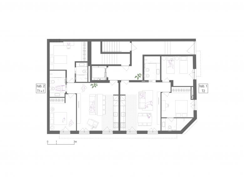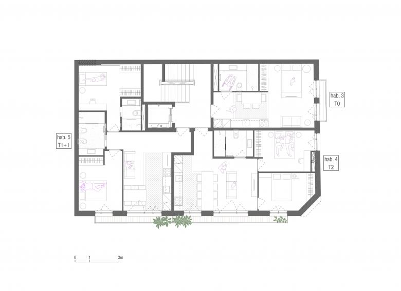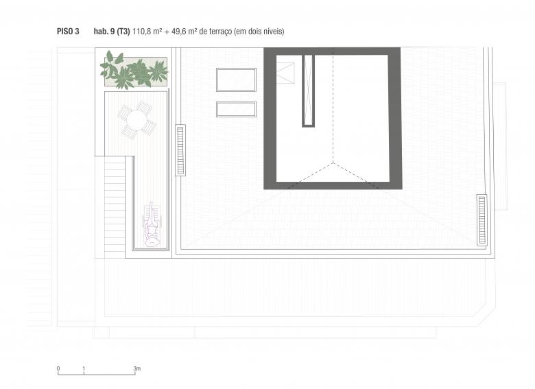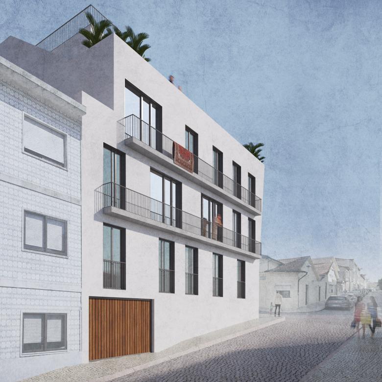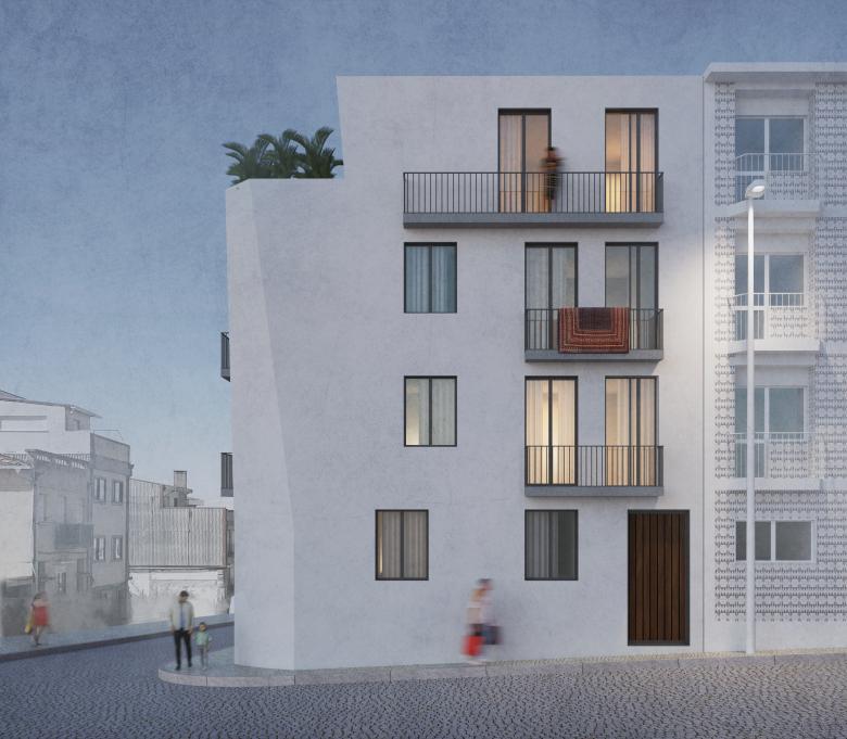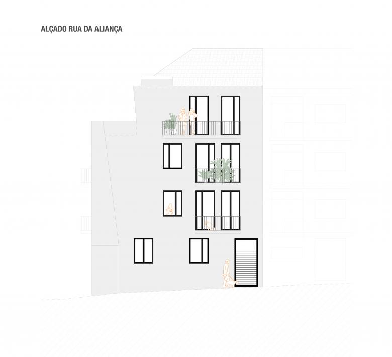 Both elevations are very sunny (west and south). The corner solution has a slightly sloping edge that gives the building its identity and a certain originality – although it is well integrated with the other buildings at the intersection of Rua da Aliança and Rua Monte Alegre.