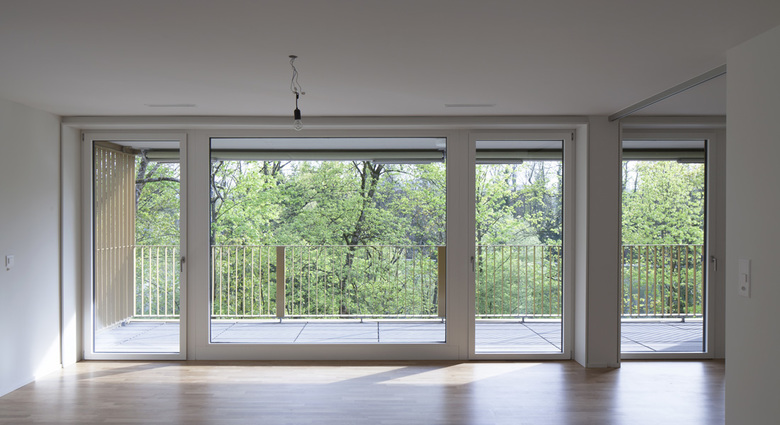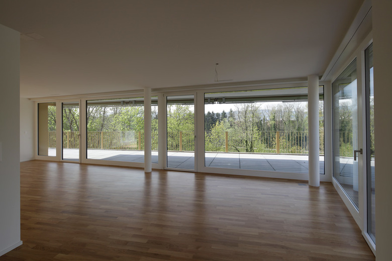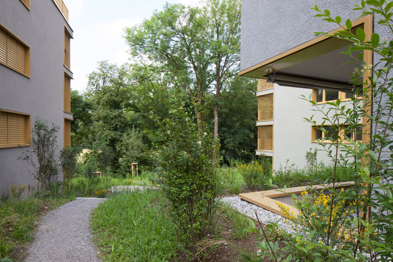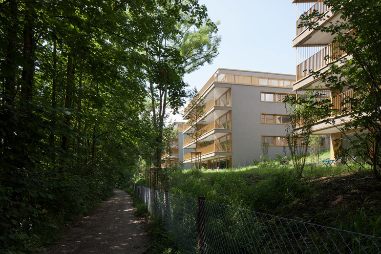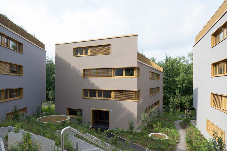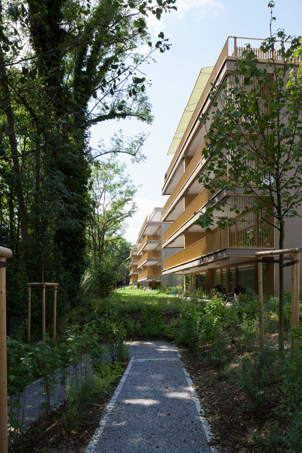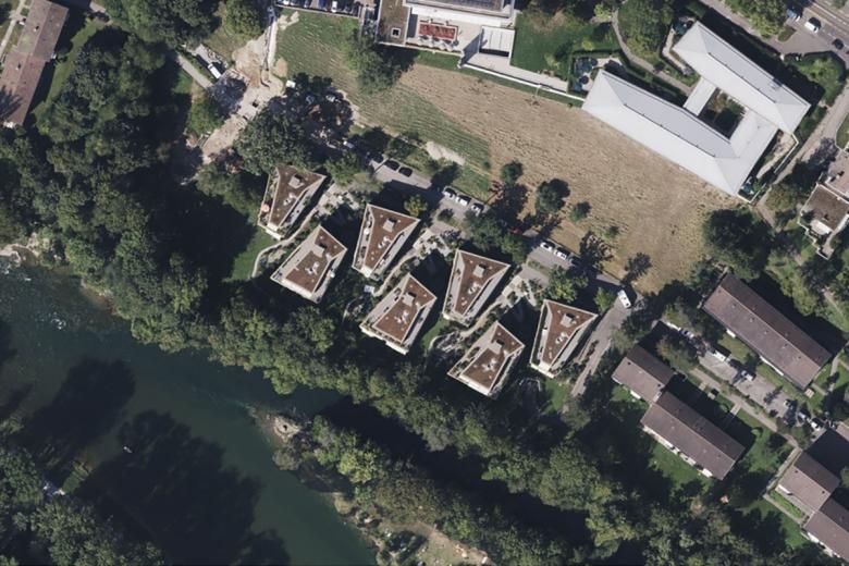 On the newly cleared site, seven individual apartment buildings were built, all of which are connected below-grade by a continuous parking garage with 63 tenant and 6 visitor parking spaces. To the east, the underground car park is accessed via a ramp which also accommodates disabled access to the project. Pedestrians will reach the development via stairs and serpentines (ramps with hairpin switchbacks) from Winzerhaldenstrasse. Surface paths embedded into a garden landscape connect the seven buildings and are inspired by natural vegetation all the way to the banks of the Limmat beyond. Each flat in the development enjoys an unobstructed view towards the river bank, and generous wooden-metal window fronts make the transition from nature to interior space seamless. Despite the high density and maximization of the site, a high quality of outdoor space was achieved, and the relationship to the natural landscape is equal amongst all 67 flats. The entire project was executed and certified according to the Minergie P-ECO Standard.