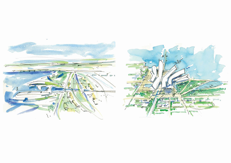 The fluid forms of the pavilions are designed to evoke a wide variety of maritime interpretations without obvious references, and to define the museum as the National Maritime Museum of China. These interpretations could range through rolling waves, an outstretched hand over water, a coral or sea anemone, a small fleet of moored vessels in port, or perhaps a school of auspicious jumping carp. However, our more pertinent aim was to shift this direction of Chinese museum architecture away from the monumental to the humanistic, and this aspect dominated the jury’s thinking in selecting our design in the international competition.