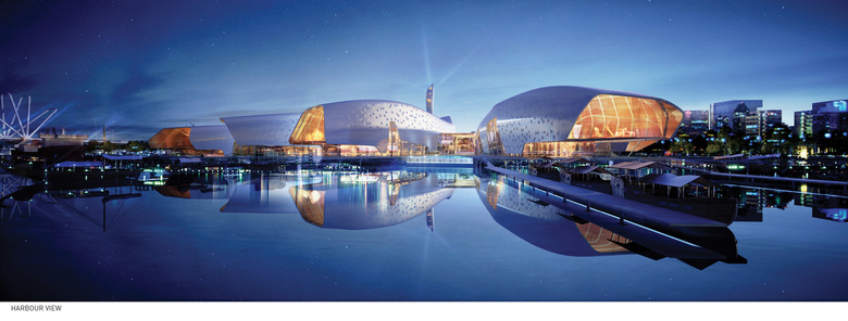 The architecture is expressive of multiple interpretations (such as an open hand, anemone, corals, vessels in port), not as obvious metaphors, but as enticements for visitation and exploration of a multifaceted set of experiences within.