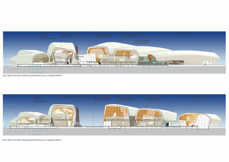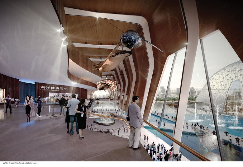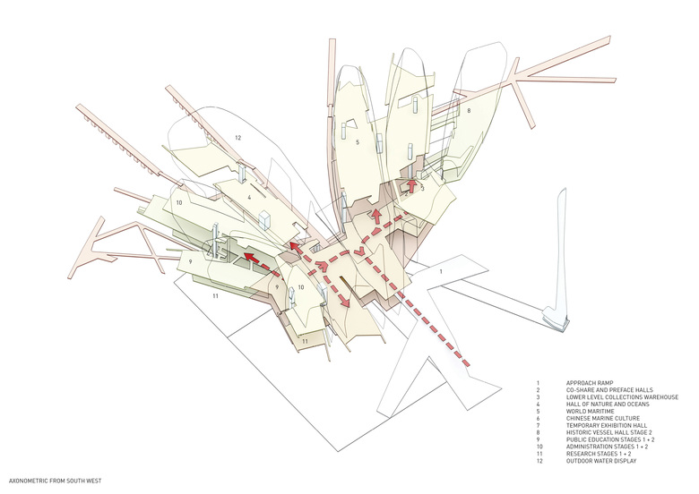 As well as radiating movement lines, interconnecting bridges facilitate cross-movement between the World Maritime Civilization Hall and the Chinese Marine Culture Hall (and its associated Historic Vessel Hall) with the idea of enabling visitors to appreciate parallels between World and Chinese maritime events over the centuries.
