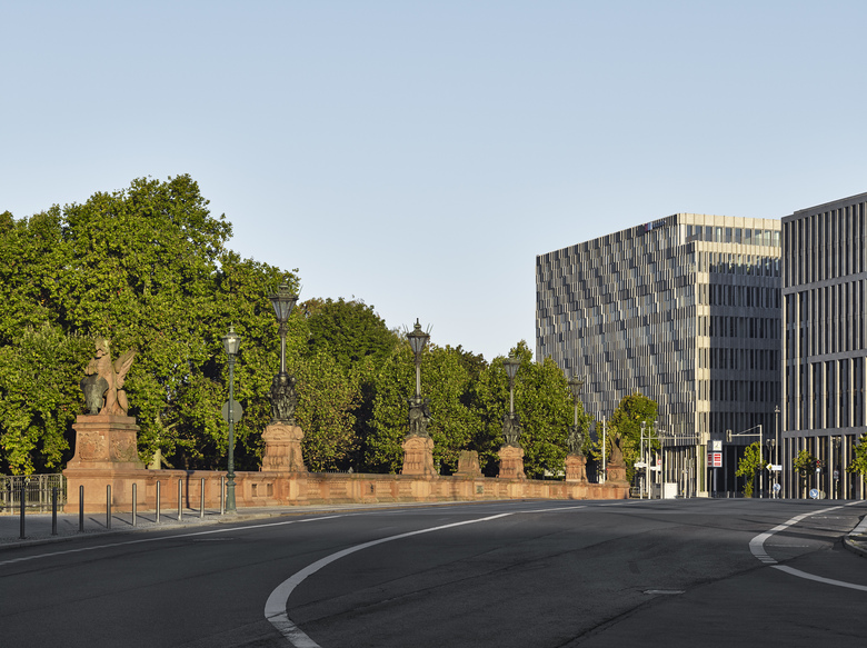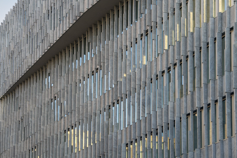 konstruktion eine Aluminium-Bandraster-Fassade mit natursteinverkleideten Brüstungsbändern vorgehängt, die von schmalen, vertikalen Naturstein-Finnen überlagert werden. Nur 8 cm breit und einem schnellen Rhythmus von 67,5 cm folgend, überziehen diese den Baukörper wie ein leichter, eleganter Vorhang - anders als bei einer Lochfassade treten die Öffnungen so eher in den Hintergrund. Die Finnen sind über Stufen von je 1/3 Geschosshöhe in der Tiefe variierend gestaffelt und bilden so einen diagonalen Verlauf, der der steinernen Hülle in einer umlaufend fließenden Bewegung die Schwere nimmt. Es entsteht ein abstraktes Fassadenbild, das mit seiner dynamisch changierenden Struktur je nach Blickwinkel mal offen, mal geschlossener wirkt und aus der Ferne fast zu flirren scheint.