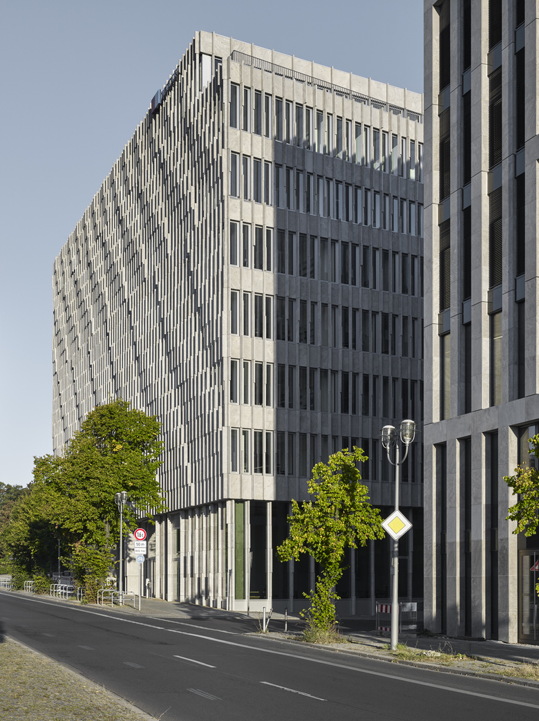 Mit seiner bewegten Fassade aus hellem Naturstein fügt sich das Gebäude in das Material- und Farbspektrum des Ensembles ein. Die unkonventionelle Verwendung des in der Berliner Bautradition verankerten Muschelkalksteins verleiht ihm innerhalb dieser Verwandtschaft gleichzeitig eine individuelle, einprägsame Erscheinung. Oberhalb des transparent gehaltenen Sockels ist der Betonskelett-