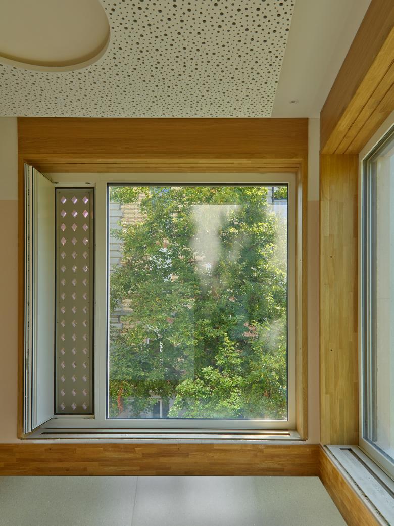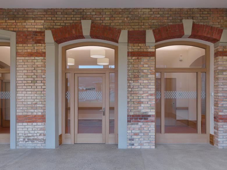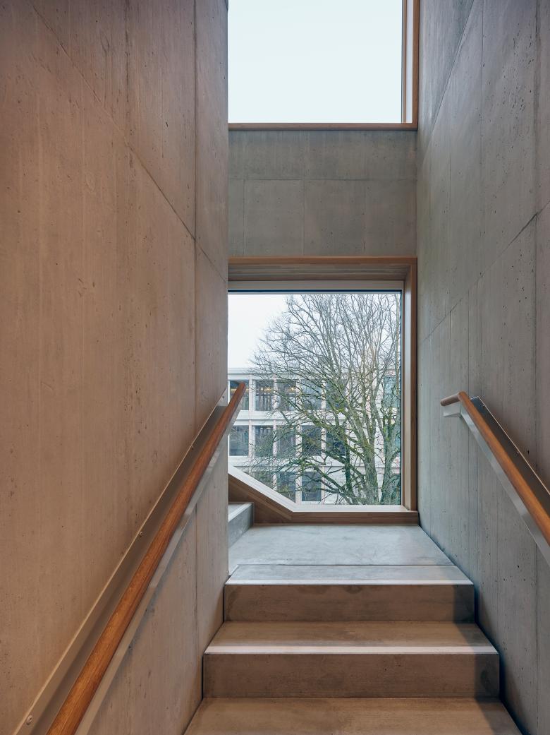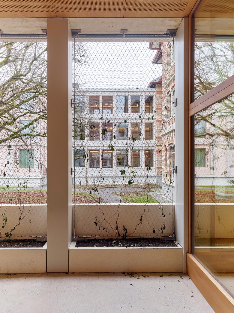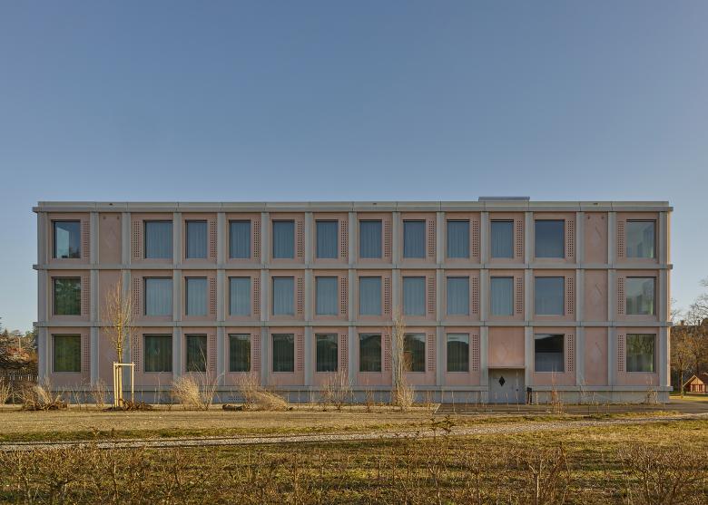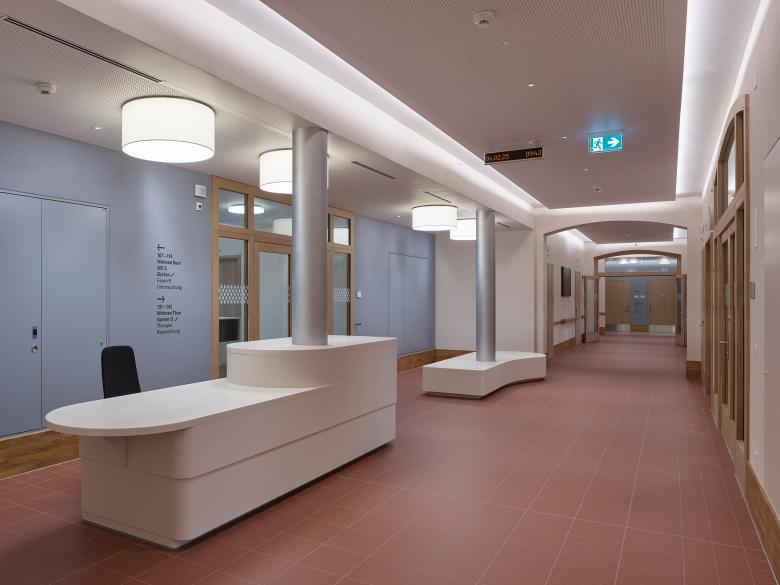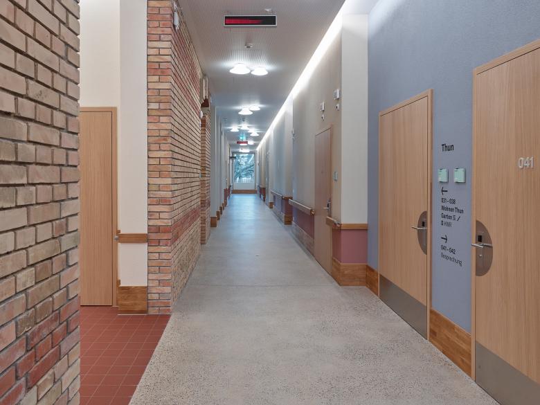 Die Grundrisstypologie der neuen Musterstationen geht auf die Bedürfnisse der Patient*innen ein. Eine transparente und zentral gelegene Eingangssituation soll eine positive Atmosphäre schaffen und Offenheit symbolisieren. Die lichtdurchfluteten und überbreiten Gänge führen zu den Zimmern und Wohnräumen. Die Zimmer sind auf den Park hinaus nach Osten oder Westen orientiert, ohne direkten Bezug zur Bahnlinie. Die neuen Zimmer sind Rückzugsorte der Patient*innen, die durch ihren modernen Charakter und die angenehme Raumatmosphäre an ein schönes Hotelzimmer erinnern. Der Neubau, eine Neuinterpretation einer einbündigen Gebäudetypologie, wird das Areal positiv verändern und ordnet sich in die neue Umgebung mit seiner U-Volumetrie ein und ergänzt die bestehende Situation. Das Gebäude soll mit seinem offenen und geschlossenen Charakter die Situation auf dem Areal verbessern und durch seine vertrauten Elemente eine positive Stimmung vermitteln.