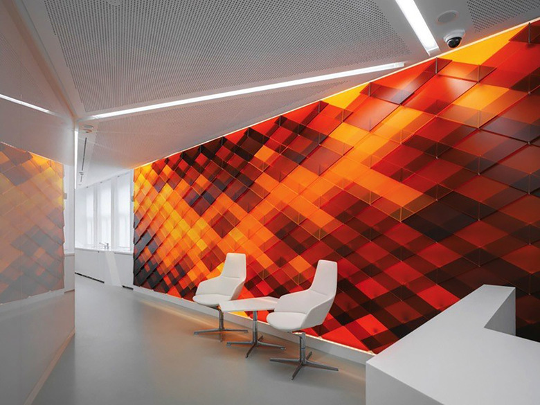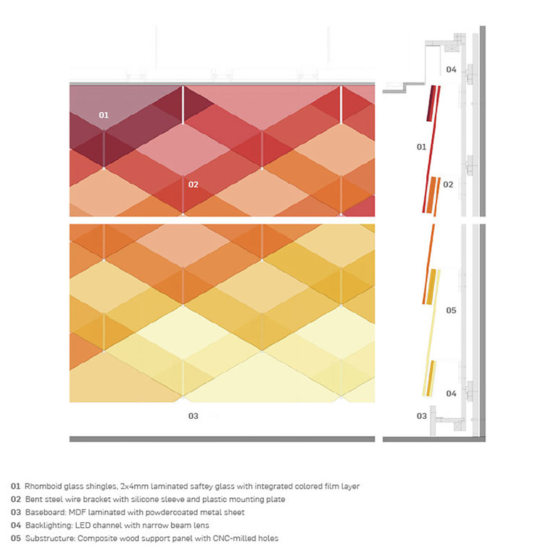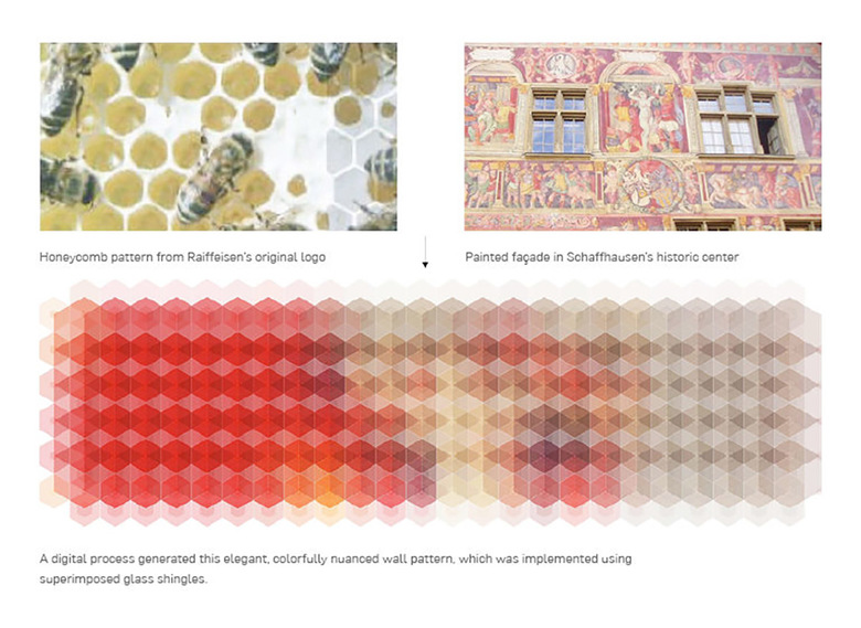 For the design of the bank interior space, the project draws on the tradition of painted façades in the historic center of Schaffhausen, which characterize the city’s public realm. Together with ROK, Rippmann Oesterle & Knauss, these colorful murals were digitally transformed for the interior of the bank into a pattern of rhomboid glass shingles, establishing both a reference to the Raiffeisen brand’s original honeycomb logo and anchoring it with the local history. The project creates a subtly composed space of encounter, which piques the interest of passers-by through color, lighting and reflections, and provides customers with a welcoming, stimulating atmosphere. The traditional features of Schaffhausen’s public façades are transported into the interior, and in return, the bank uses transparency to open itself to the city.