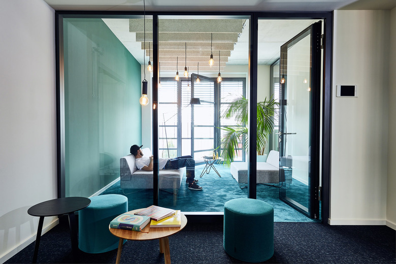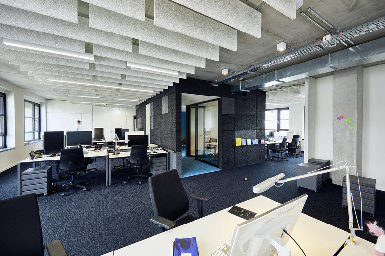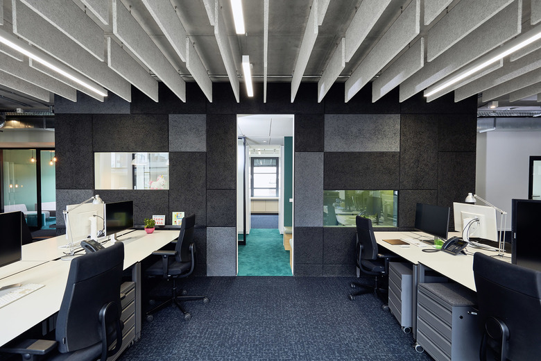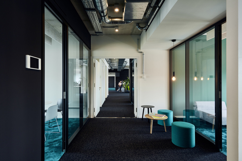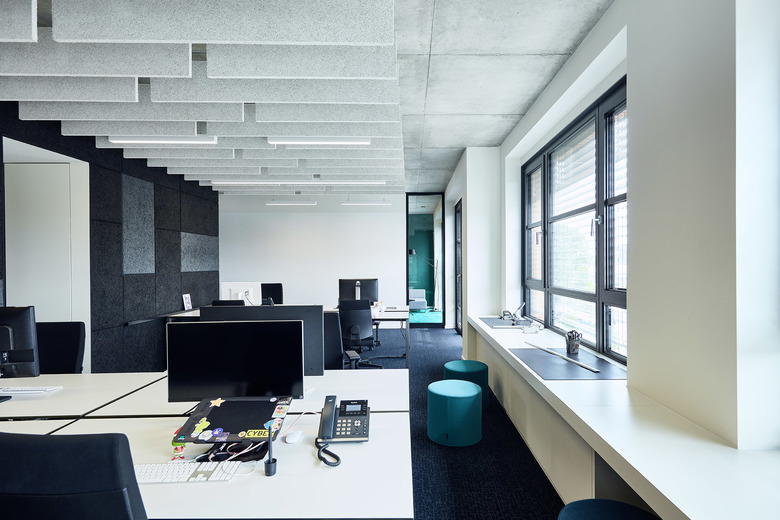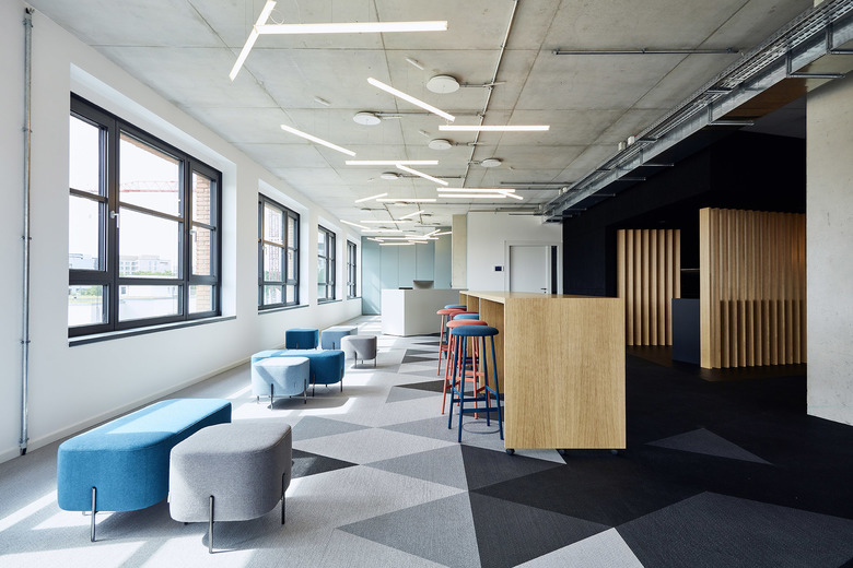Der Einsatz verhaltener Materialien sowie der vorherrschenden Farben Schwarz, Weiß und Grau in Kombination mit warmen Holz- und Farbakzenten schaffen eine cleane Arbeitsatmosphäre. Der zurückgenommenen Gestaltung der Arbeitswelt in Anthrazit und Weiß mit Blick auf die Rohbetondecke stehen die Bereiche für Meeting und Kooperation, Rückzug und Kommunikation gegenüber, die über die Ausbaumaterialien farbig angelegt wurden. In der Arena werden diese durch lose Möbel in den Farbwelten Blau, Grün sowie Rost und Apricot ergänzt.