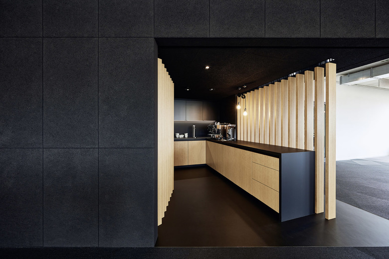 Die Kubatur der in den Raum hineinragenden Küche ergibt sich aus der Bestandsstruktur. Durch schwarze Hera-Platten eingefasst und mit Holzlamellen flankiert wirkt sie wie ein Akustikschwamm im Raum. Direkt angegliedert an die Eingangszone ist ein großer Konferenzraum für vertrauliche Kundengespräche, der auch für Videoscreenings mit den anderen Standorten der Agentur genutzt werden kann.