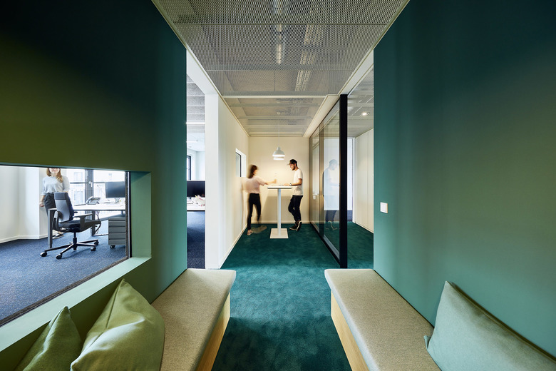 Durch die Boxen wird die gesamte Fläche neu organisiert und werden die einzelnen Nutzungsbereiche geschaffen. Ein Erschließungsgang entlang der Fassaden wird gestalterisch durch die Anordnung von weißen Akustikbaffeln über den Arbeitsplätzen betont, hohe fassadenseitige Glasschwerter bilden Blickachsen in die benachbarten Meetingräume. Maßangefertigte Fassadentische, die sich am Fassadensprung orientieren, bieten die Möglichkeit für flexibles Arbeiten und Werkeln.
