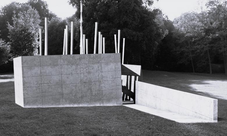 A threshold path leads into a structure of concrete and light, where the rhythm of the vertical pillars – like trees or breaths – marks the dialogue between interior and nature.