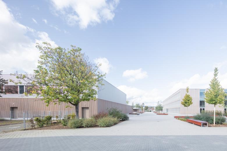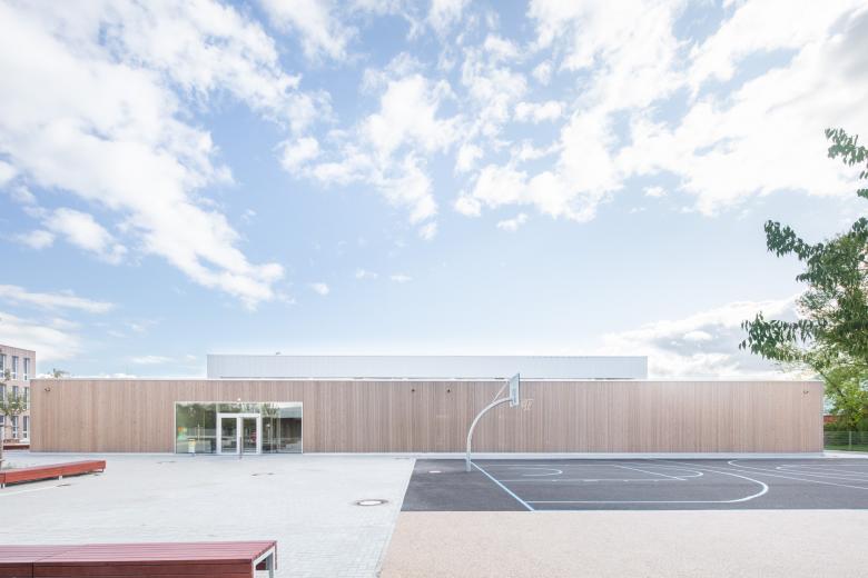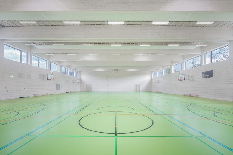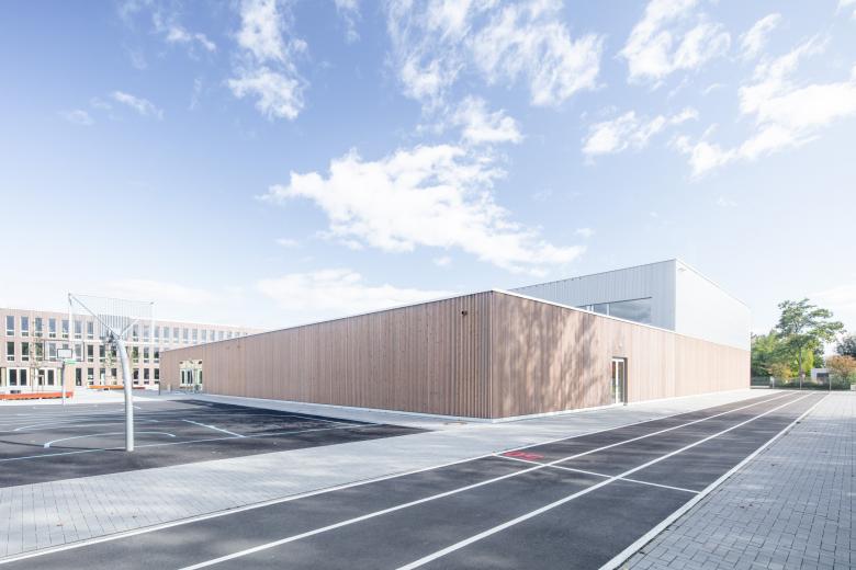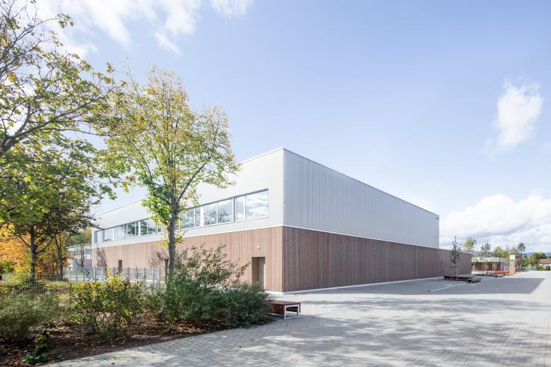 Zum Schuljahresstart 2019/2020 erhält das Gymnasium Nord im Frankfurter Stadtteil Westhausen eine neue Dreifeldhalle. Aufgrund des hohen Vorfertigungsgrades und der signifikanten Reduktion der Bauzeit fiel für den Aufbau des Gebäudes die Wahl auf eine Holzkonstruktion: Der eingeschossige Bereich der Halle, in welchem Umkleidekabinen und Geräteräume angesiedelt sind, ist in Holzelementbauweise errichtet; der Hallenbereich selbst ist aufgrund der großen konstruktiven Spannweite als Holzskelettbau ausgelegt. Holzlamellen und eloxiertes Aluminium prägen die Materialität der Außenfassade und werden in den Innenräumen durch schlichte, unbehandelte Wandvertäfelungen ergänzt.