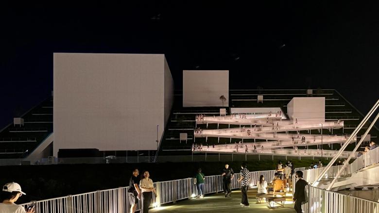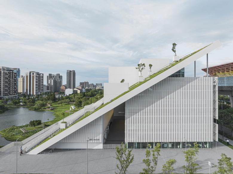 Taoyuan Museum of Art is divided into two buildings: the art museum building and the childrens museum building, both designed in consideration of the relationship with the surrounding environment.To the south is a residential complex built by a private developer as a mini-development, and to the north are a forest and a lake rich in nature. The surrounding ground is raised to form a hill-like slope with ramps and pergolas to host park-like activities.With a 30-degree incline, the hill has several holes that form terraces from where people can enter as if crawling under the roof. Tucked between the roof and the interior exhibition rooms are rich spaces by terraced various activities such as cafe and library. The museum can be enjoyed while always feeling the relationship with the outside.