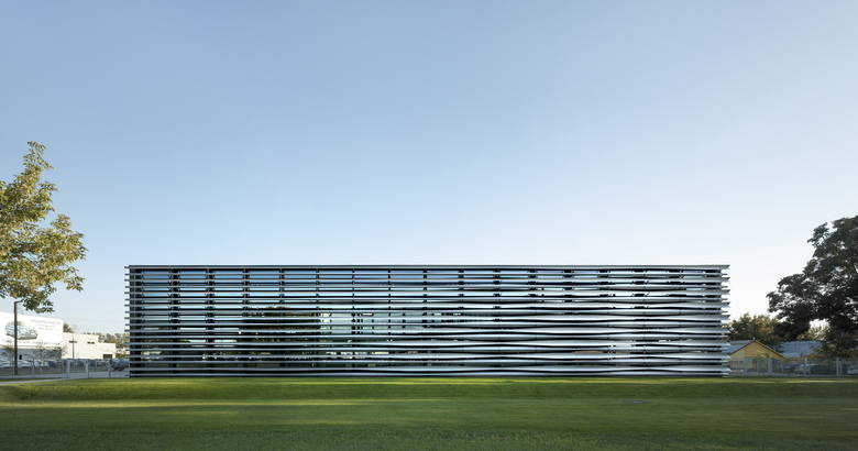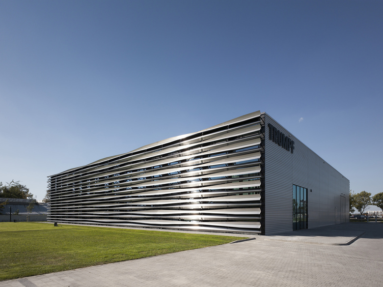 As if wanting to tell a story about the inner workings of the building, gleaming stainless steel fins cover the façades of the new Trumpf Poland Technology Center in a soft gradient. Produced from high-grade sheet steel, the fins are laser-cut and folded to widen and narrow over their 10-meter length — a direct architectural application of the machine tool- and laser technology for which the company is known.