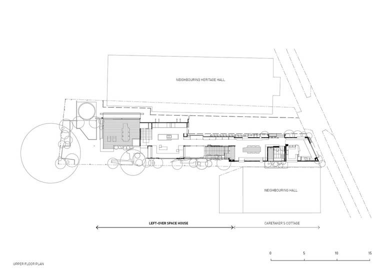 This narrow private house demonstrates what can be achieved on the myriad of ‘left-over’ spaces in inner cities, such as disused easements or parking lots. In this case, a 3 metre wide tiny caretaker’s cottage, adjoining a Heritage Hall has been recycled and linearly extended into a family house for parents and two children.