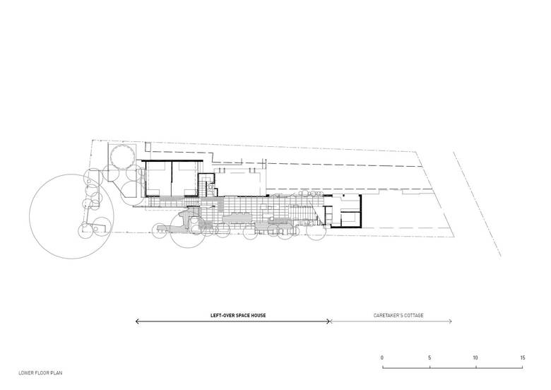 The project recycles an existing small cottage as a piece of the house to which extensions in front and back are grafted in 3 metre and 5 metre wide portions respectively.