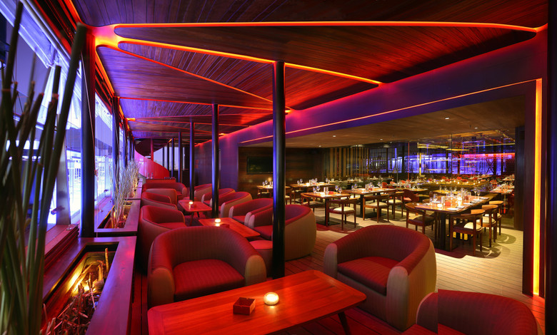 The semi outdoor whiskey and cigar lounge area to the west has the option of dining as well as lounging. Comfortable lime green and chocolate loungers flank its periphery with a bar at one end overlooking the city view. A large wooden portal frames the internal restaurant via a sheet of glass and diners can gaze into the restaurant on one side and the buzz of a club on the other.