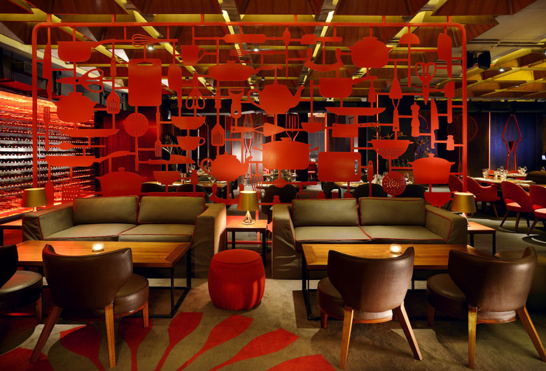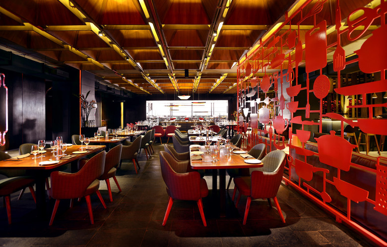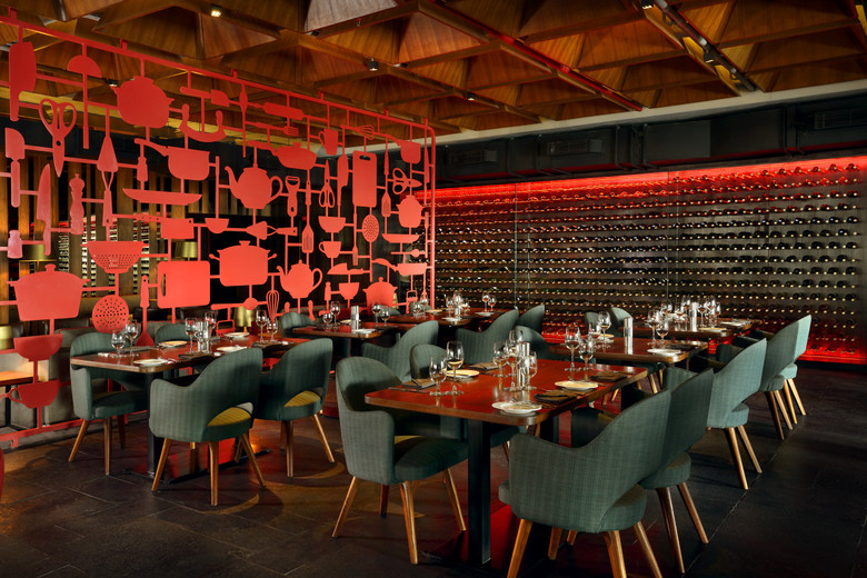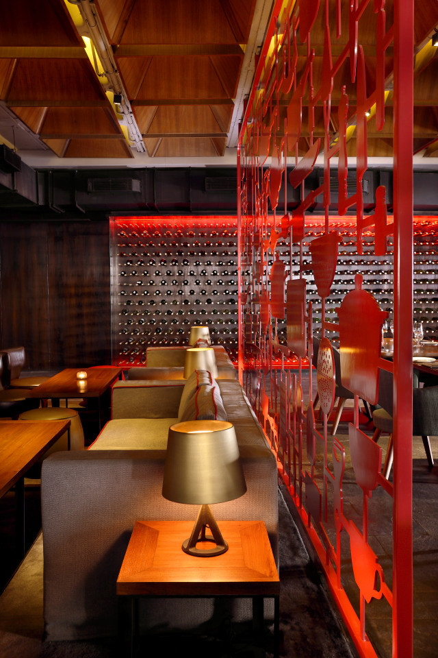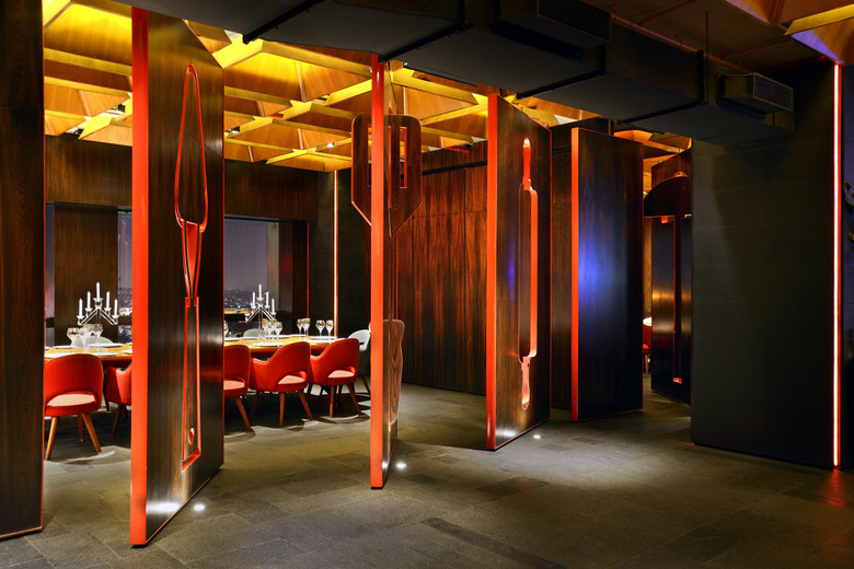 The spatial layout has 3 zones : as you enter through a foyer at the north end, an intimate indoor lounge area greets you followed by the expansive indoor dining area and then finally into a semi open cigar and whiskey lounge that looks out from a height into the city lights. The dining area to the south has an exclusive chefs table and kitchen, as well as a zone for private parties and this is demarcated from the restaurant by a set of dramatic screens customized by the graphic designers. Giant outlined cut outs of kitchen tools clad in smoked veneer accented with red edges form pivot screens which allow for integration and separation of the fine dining and chefs tables from the main space. The utensil cut-outs themselves have the ability to rotate from their base creating and interesting layering and interplay according to the degrees of privacy required in the space.