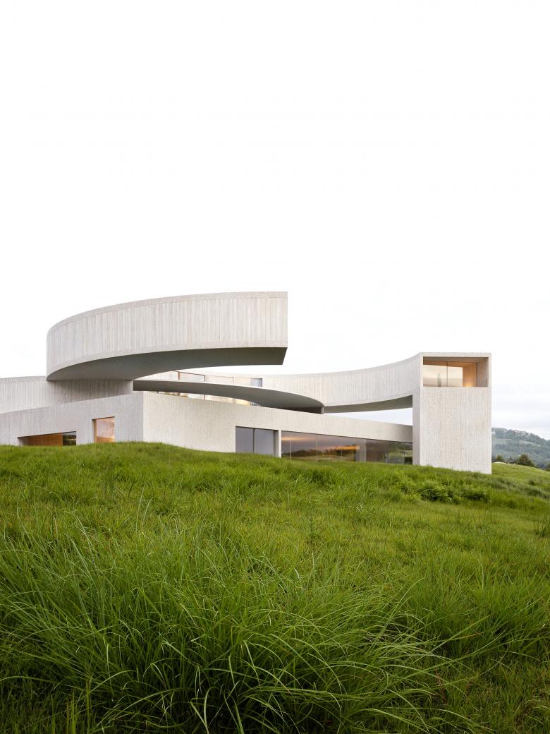 In the southern area you can enjoy the predominant view of the lake, a swimming pool delimits the space between the man-made living area and nature, here the first ring opens and the projecting one wants to close on itself, but ends in an overhang creating a sense of suspension.