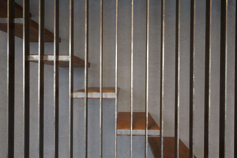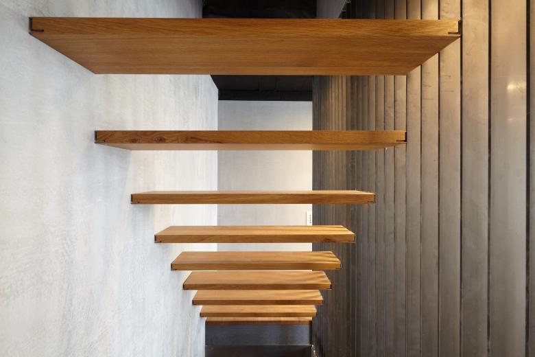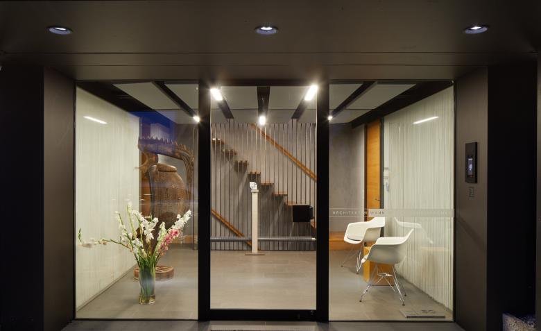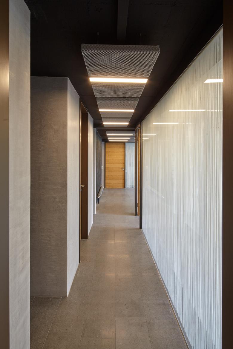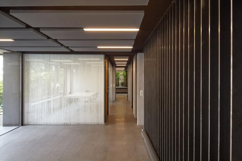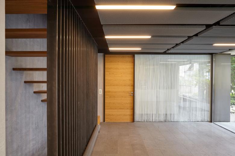 The residential and office building erected about 50 years ago served as the head office of Wannenmacher + Möller architects ever since 1968. As the company continued to expand, more and more residential apartments were converted to provide additional office space. The resultant functional limitations were remedied by means of minor structural alterations, thereby also revitalising the appearance of the premises. All the suspended plasterboard ceilings and dry walls of the offices and conference rooms were to this end removed and replaced with respectively expanded metal ceiling canopies and glass walls. White string curtains act as screens without sacrificing transparency altogether. The existing basalt flooring outside the entrance was extended to the interior to replace the wall-to-wall carpeting of the entire ground floor. Oak was used for doors and the new staircase, creating a warm contrast to the rather cool surfaces of the floor, walls and ceiling.