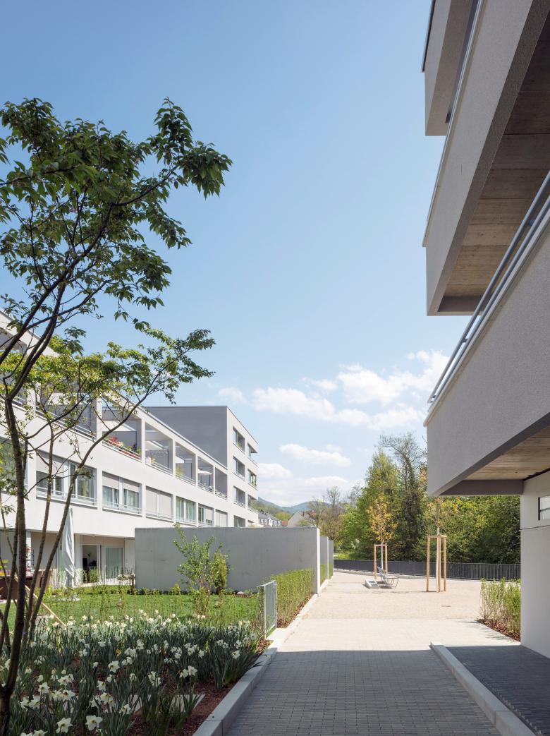 Gebäude – Die Neubebauung erweitert das Wohnraumangebot der Schmitthenner-Siedlung um barrierefreie Kleinwohnungen, Rollstuhlwohnungen und großzügige Maisonetten mit Dachterrassen. Die Idee des Genossenschaftlichen wird unterstützt durch die zentrale Anordnung der neuen Geschäftsstelle der Baugenossenschaft am Quartiersplatz zwischen neuer und alter Siedlung und ergänzt um einen Mehrzweckraum für alle Bewohner des Quartiers. Für die Neubebauung werden in Anlehnung an die qualitätsvolle Gestaltung der Bestandssiedlung dauerhafte und wertige Bauweisen eingesetzt: Monolithische Außenmauern mit einem hydrophilen, gekratzten mineralischen Dickschichtputz, großformatige eloxierte Holz-Aluminium Fenster mit textilem Sonnenschutz, Massivholztüren, Werksteinfensterbänke und sichtbar verbleibende Betonoberflächen.