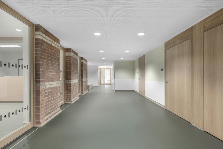 Die Flure des Neubaus binden an die Altbauten an, die Räume erlauben Blicke in die Natur. Die Höhenstaffelung folgt der Topographie, die Form reagiert auf die Risaliten der Altbauten. Die Ziegelfassaden der Alt- und Neubauten unterscheiden sich in Farbigkeit und Details. Die Altbausubstanz wird behutsam an die neue Nutzung angepasst. Die Nachhaltigkeit des Projekts liegt in der optimalen Verbindung der Gebäude. Dadurch ist der Bestand gleichrangig gegenüber dem Neubau, was zentrale Voraussetzung für Erhalt und sinnvolle Weiternutzung ist.