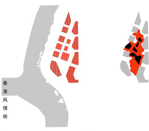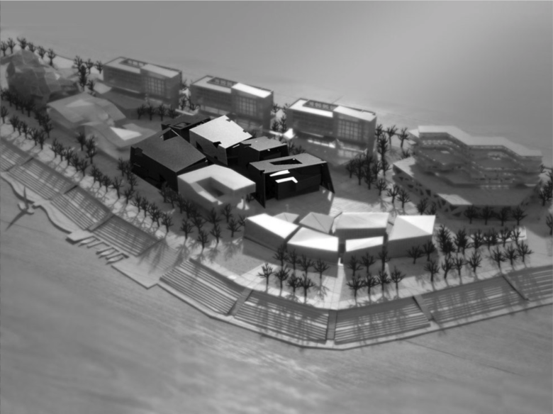 The site is located between Nanjing downtown and the airport in a development zone along the Qinhuai river that passes through the city as well. A group of architects works together on the bar and shopping area with a master plan defined by Tongji University. Our mission is to enclose the two squares in both ends of the site with other architects, and to introduce two pedestrian streets. The approach is using the difference in topography to make a three dimensional street network, which allows the people to reach easy every single shop, and to create more public spaces.
