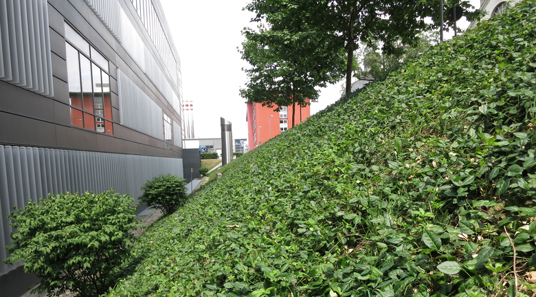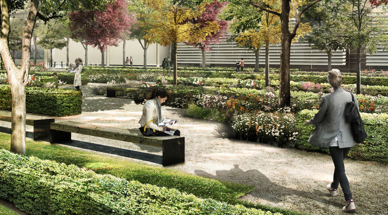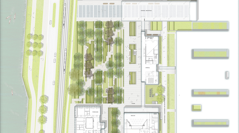 Das Forum wird durch Streifen aus Heckenpaketen und Staudenpflanzungen sowie Wegen gegliedert. Das strenge Muster wird hierbei durch ein Spiel aus unterschiedlichen Dimensionierungen der Breiten und auch horizontalen Versprüngen aufgelockert. Die Wegestruktur aus wassergebundene Wegedecke lädt zum Aufenthalt ein, eröffnet kleine Räume innerhalb der Pflanzflächen entlang der Hauptwegerichtung, die diagonal über das Forum zum Haupteingang führt. Das Verspringen der Wege erlaubt viele Sichtbeziehungen und entschleunigt die strikte Wegführung. Die Gehölze schaffen sowohl sonnige, wie auch schattigere Bereiche für Wege und Stauden.