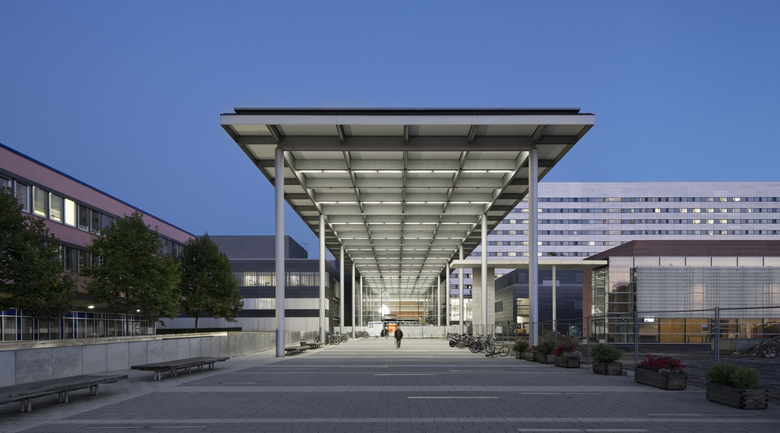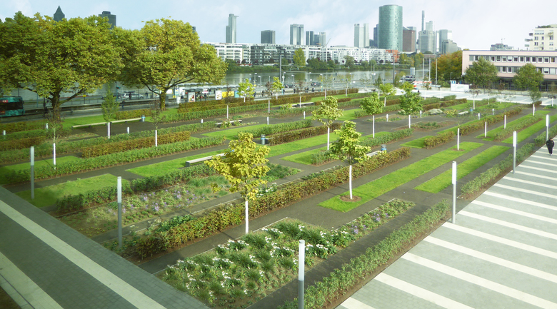 Die Außenanlagen des Klinikums Frankfurt an der Goethe Universität bieten unterschiedliche Qualitäten. Die Hofbereiche sind mit Steinplatten in geometrischer Anordnung von Schwarz-Weiß Kontrasten gestaltet, die Bebauung ist durch Baumalleen gerahmt, die Freiräume finden eine Aufweitung hin zu einem gepflasterten Platz. Auf diesem Platz sind Sitzbänke räumlich eingefaßt in geometrisch angelegte Pflanzbeete und Hecken. Die Geometrie der Raumfolgen findet Auflockerung durch dicht gesetzte Stauden in den unversiegelten Bereichen.