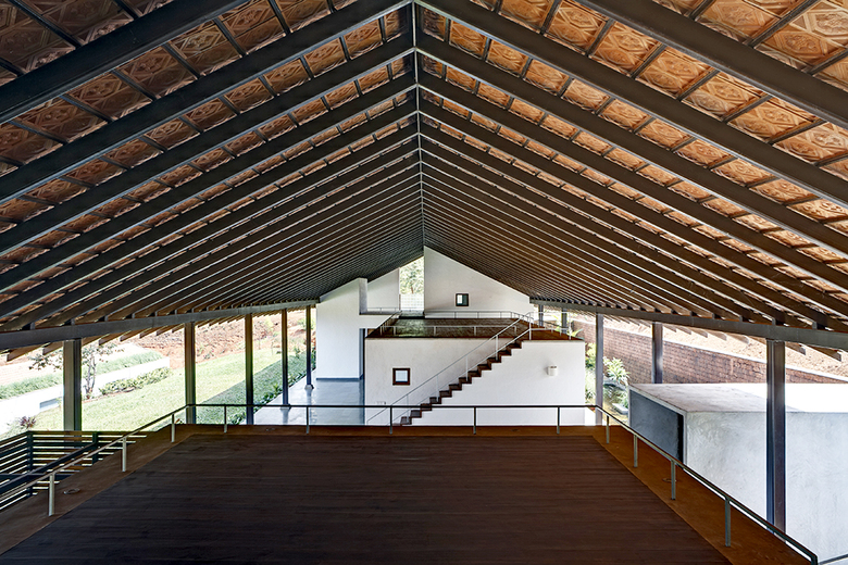 Located in the verdant environs of eastern Goa, the Think Tank Retreat is composed of ten living units and a health centre. The ancillary programs of the health centre (massage rooms, a conference facility and kitchen) are imagined as independent boxes that are integrated with a common plinth under a large clay tile roof. The terraces of each of these separate boxes are also accessible and serve as useable covered spaces for informal meetings, yoga, and meditation.
