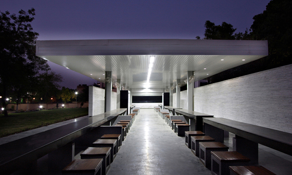 The building block has a kitchen block to the east, which is a fully enclosed space to cook and serve in. As One walks along the length of the building westwards, initially the eating enclosure is defined by two walls and a roof, further still the sense of interior is defined by one wall and the roof, further still the space is articulated by only one wall, and yet further still, there is only the floor, and then that too stops continuing.