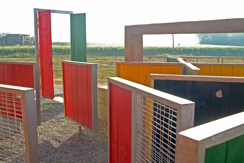 This playground is – for the children as much as for the design team – an act of irreverence towards all that architects deal with in our everyday life. The concrete band running diagonally through the playground is simultaneously a path and a diagrammatic sliver of a home which starts at the green door with a front courtyard (a public space) transforms into a bench and then as it moves towards the center of the playground, it hints towards an identity that could be wall, a roof, a bed (a more private space) and so it moves onto the rear courtyard (a semi-public space).