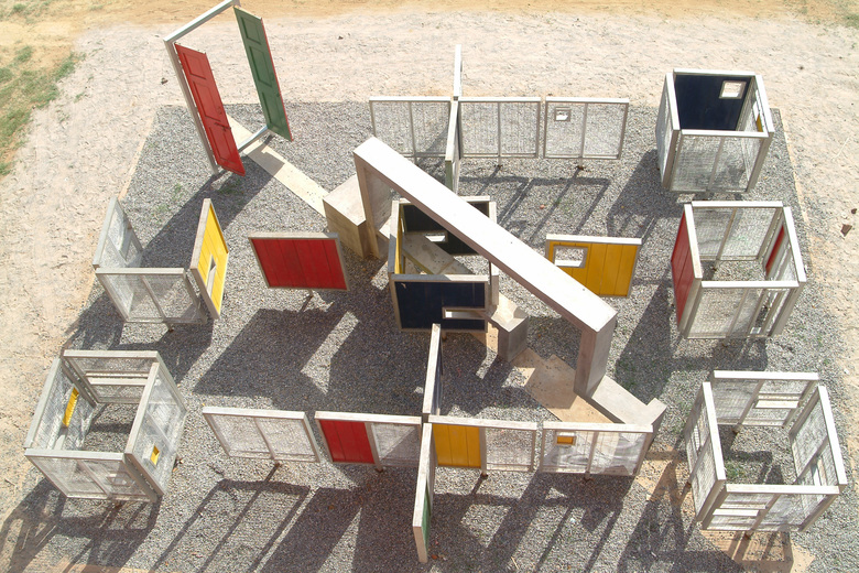 We approached the creation of the playground a story where the children could redefine the storyline through the kinetic dynamics of the playground each time they engaged with it. A playground that was as dynamic as the games that unfolded on it. The playground was seen as the canvas on which a child could unlock new worlds – different from the fixed spaces determined by adults in her day-to-day life. Although the playground we created is potentially ever changing in its structure – there is a formal structure to the space within which the moving parts define possibilities. It is placed on a regular grid of pivoting panels, set on a squared gravid pit with a diagonal undulating concrete path running through it. The path starts on the ground, then elevate into space before coming down again.