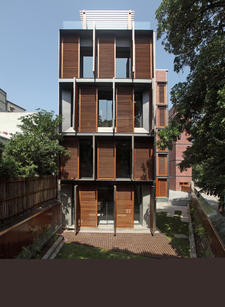 The Tower House is a multi-generational home on a peculiar wedge-shaped site, on the end of a row of semi-detached buildings in New Delhi. The building is conceived as three distinct masses that respond to the site’s geometry and the family’s needs. In a city where the urban texture is increasingly defined by plaster buildings clad with laminates and textured paints, the tower house attempts to bring back an architectural language that appears to be slipping away from our urbanscape. Internally also, countering the tendencies towards false ceilings and decorated surfaces, the building celebrates the exposed concrete ceiling, cast in situ floors and exposed brick walls. The narrow front portion of the house comprises of 2 living spaces, both double height which sectionally connect the four floors of the house. Materially the front block is constructed out of stone and wooden louvers with the fenestrations informed by the sight lines defined from within the building. The second block is the private living space for the family. Sectionally simpler, this block is constructed in brick and steel and set within a very rigid geometric grid of open and closed zones. In an increasingly digital age, the house aimed to disrupt trends of cellular living by designing common spaces that allow for autonomous and collective living at once. The double height family spaces force social contact in perhaps a banal but vital day to day manner. The third block is a service tower which houses staff living spaces, generators, water pumps and other services. This tower is a reconstructed remnant of the previous building that stood on the site and a reminder of the site geometry.