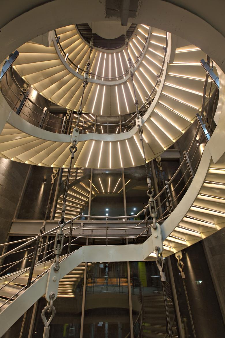 The building uses a large proportion of re-used material and an extremely high percentage of easily renewable materials.  The building is defined by a unique span free steel structure which is set outside of the main building envelope and designed on the principle of a stabilised cube which is diagonally braced.