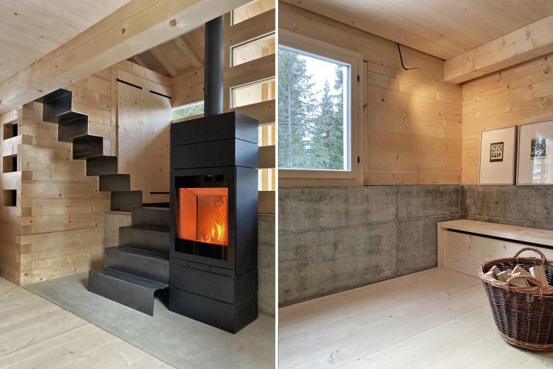 Das Holz dafür kommt vom gegenüberliegenden Nordhang welcher sich in Sichtdistanz zum Bauplatz befindet. Der Holzbau ruht auf einem Sockel aus rauhem Sichtbeton, welcher als wasserdichte Wanne ausgebildet wurde um den Hangdruck und dem im Winter meterhohen Schnee bestehen zu können. Boden und Dach sind gedämmt, die Wände sind bewusst nicht zusätzlich isoliert um das Material in seiner natürlichen Oberfläche altern zu lassen. Die Quelle welche ca. 200 Meter über dem Grundstück gefasst wurde, versorgt die Hütte mit frischen Quellwasser, Strom wird durch ein PV Modul auf dem Dach erzeugt.