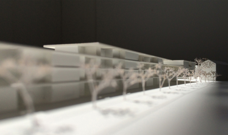 Das städtebauliche Konzept beruht auf der genauen Analyse der Situaiton und seiner näheren Umgebung. Der nördliche Längsbau nimmt die strassenbegleitende Bebauungsstruktur entlang der Oberseestrasse auf. Fassaden- und Dachversätze gliedern das Volumen und die Proportion des Baukörpers. An der Gabelung Obersee-/Schönenstrasse konzentriert sich das Volumen zu einer Art Kopfbau, welcher durch die ausformulierte Arkade im Erdgeschoss einladend und offen auf seine Umgebung wirkt.