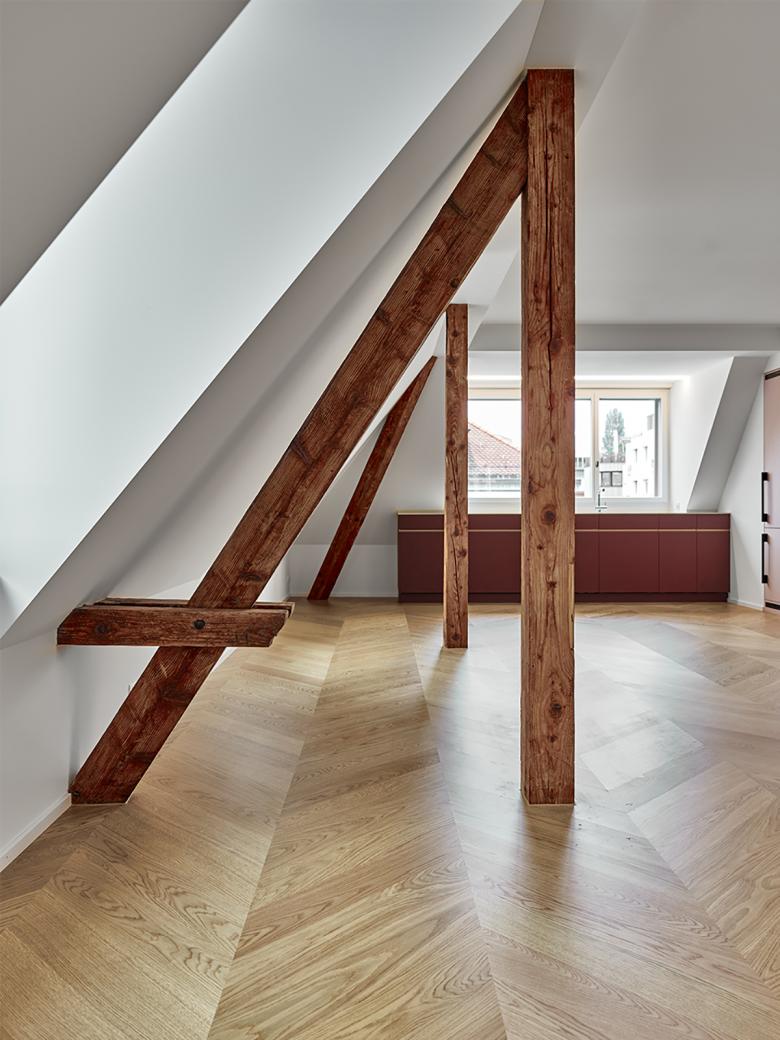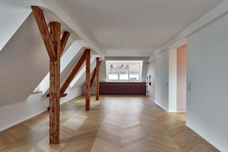 Der Entscheid, die grosszügigen Geschosswohnungen mit bis zu sechs Zimmern zu erhalten, wurde zu Beginn des Projektes gefasst, jedoch in Verbindung mit komplett neu erstellten Badezimmern und Küchen. Zudem wurde der marode Estrich zu einer modernen Dachwohnung mit privater Dachterrasse umgestaltet. Im Estrich lagerten zudem bis zum Umbau das gesamte Œuvre des Künstlers Walter Haymann. Im neu erstellen Kunstlager welches komplett unter Terrain liegt und durch einen Durchstich mit dem Bestandesbau verbunden wurde, ist nun das Gesamtkunstwerk sicher archiviert.