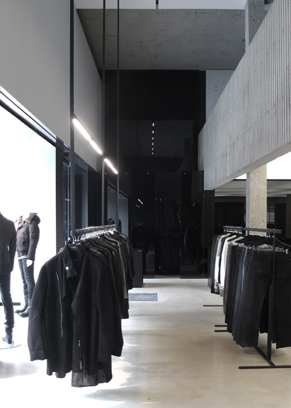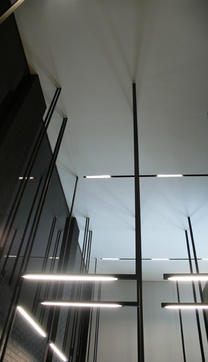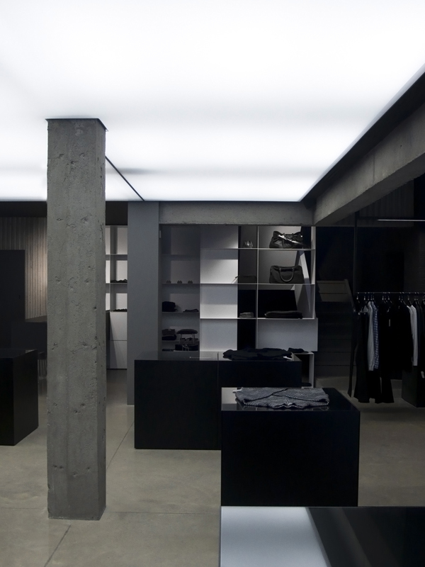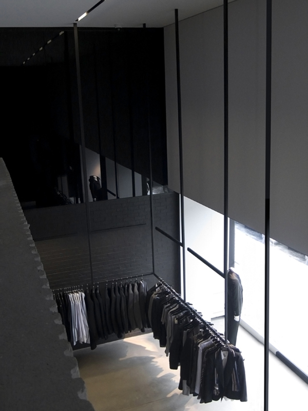 The ensemble of the new elements, such as smoked glass, mirrors, and movable display elements (of painted aluminum and rubber) work in counterpoint to the building’s original structure. The luminous ceiling (Extenzo) stretches to fit the form of the mezzanine; the ceiling therefore illuminates the zone of the movable display cases, and contrasts with the clothing racks, which function as linear lighting for the space, suspended from the second floor ceiling like stalactites. The original curving staircase dramatizes the moment one reaches the second floor, where we find Michel Brisson’s office and the V.I.P. room. Various service spaces are also located on the second floor, toward the south portion of the building.