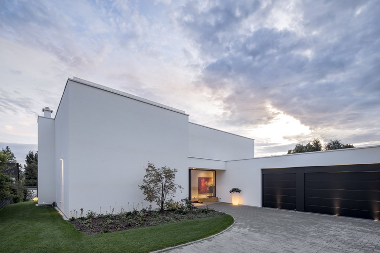 Die Gebäudeform ergibt sich aus der Notwendigkeit die Bewohner vor ungewollten Einblicken zu schützen und einer großzügigen Öffnung zur Aussicht. Das Gebäude bildet mit der angegliederten Garage einen Innenhof durch den man zum Haus gelangt. Der Eingang befindet sich in Verlängerung zur Garage und ist die einzige Öffnung auf der Nordseite. Markiert wird dieser zusätzlich durch die Tatsache, dass er sich in einem zurückgesetzten Bereich befindet welcher aber überdacht ist. Der zweigeschossige Hauptteil ist als L-Form ausgebildet und wird durch eine Sichtschutzwand im Westen ergänzt, an die wiederum eine Terrassenüberdachung angegliedert ist. Zwischen Baukörper und Wand ergibt sich der Freibereich des Gebäudes der auch den Pool beinhaltet.