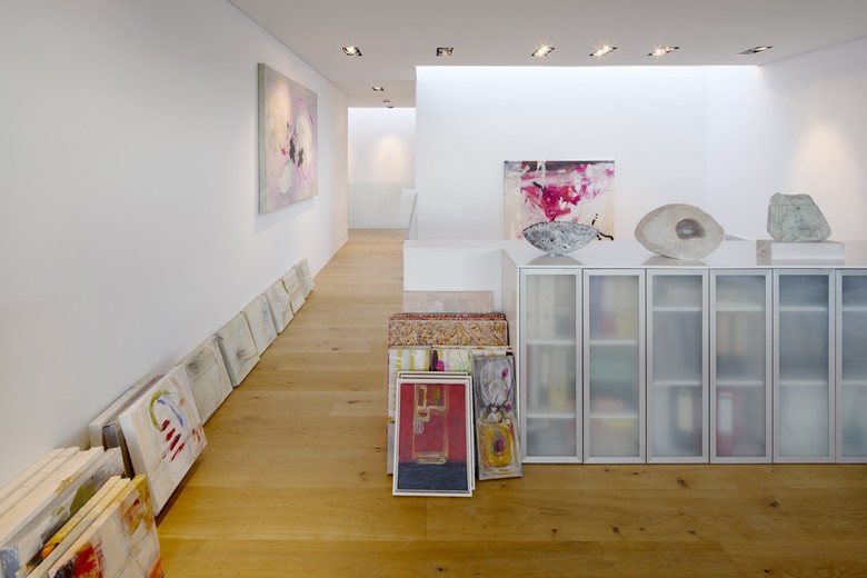 Im Erdgeschoss sind die Wohn- und Schlafräume der Eltern untergebracht während das Obergeschoss Atelier, Kinderzimmer und Fitnessbereich beinhaltet. Auf Fenster (außer Eingang) wurde im Norden und Osten vollständig verzichtet und auch im Westen ist nur ein langer zweigeschossiger Schlitz der kaum Einsichtsmöglichkeiten bietet. Die konsequente Ausrichtung der Verglasung nach Süden bietet optimalen Energiegewinn (bei entsprechender Verschattung ) und höchstmögliche Privatheit. Ergänzt werden die Südverglasungen durch zwei Oberlichter die im inneren schöne Lichtsituationen schaffen. Eines der Oberlichter befindet sich als langer Schlitz über der einläufigen Treppe, das zweite Oberlicht sorgt über dem Luftraum für Licht in der Tiefe des Gebäudes bis hinunter zum Esszimmer.