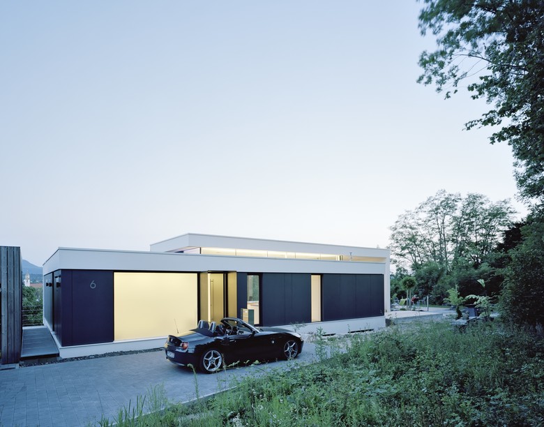 Die Garage ist im Osten des Grundstücks direkt an der schmalen Zufahrt plaziert und durch eine 1m breite Fuge vom eigentlichen Wohnhaus getrennt. Durch diese Fuge kann der untere Gartenteil über eine Treppe erreicht werden. Das Wohnhaus entwickelt sich Richtung Westen und endet schließlich in der Terrasse. Der Wohnbereich liegt mit den Privaträumen der Eltern im Erdgeschoss. Da das Raumprogramm zum Untergeschoss stark differiert werden das Schlafzimmer und das Bad in einer Auskragung untergebracht. Im Untergeschoss befinden sich die Räume der Kinder, Arbeitszimmer, Technik- und Abstellräume.