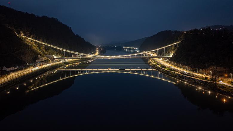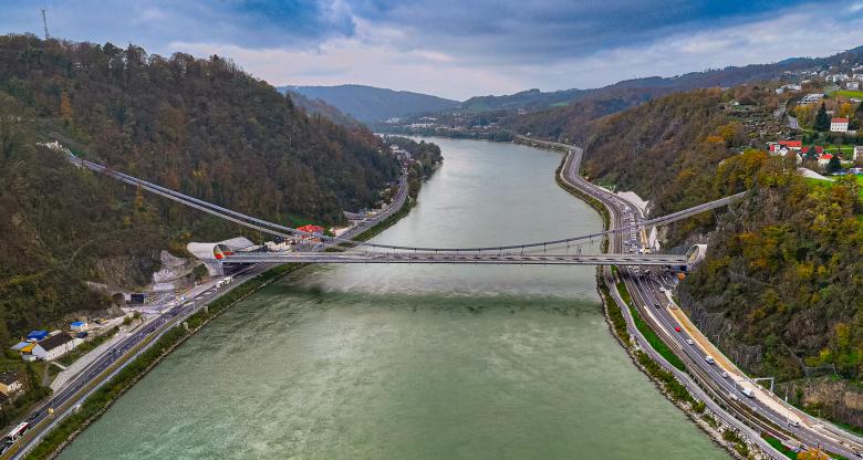 The bridge across the Danube river in Linz is part of a major Austrian infrastructure development – the A 26 highway, a four-lane western bypass for the city of Linz – and it crosses one of the busiest waterways in Europe, as well as rail tracks and two federal highways. The steep rock slopes of the Danube valley allow the supporting cables to be anchored directly in the rock, thus eliminating the need for pylons. The four-lane highway bridge could thus be designed as a pure suspension bridge. Due to the topographical conditions in the north and south, it connects to the existing traffic network via tunnels.