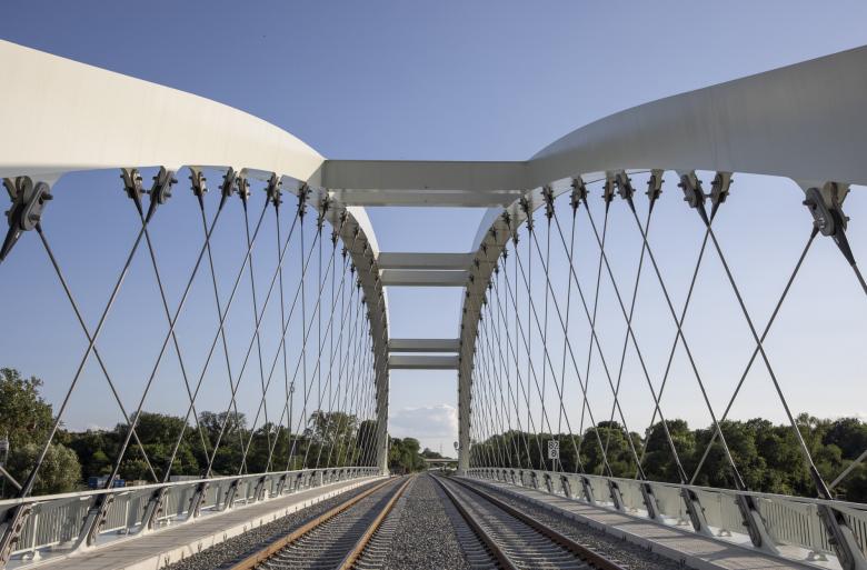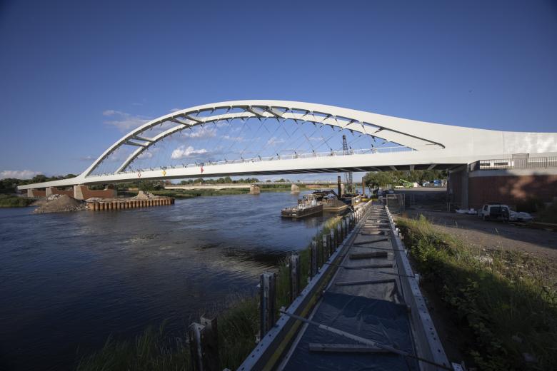 The design concept for the replacement bridge emerged from a design competition won by Knight Architects and Schüßler-Plan with their proposal: a “radiant white, elegant network arch that connects Poland and Germany on equal footing.” A delicate network arch spans the border river as a cohesive design element and integrates harmoniously into the bridge structure through shaped cross-section transitions at the arch supports. On the Polish side, a three-span approach bridge continues seamlessly.