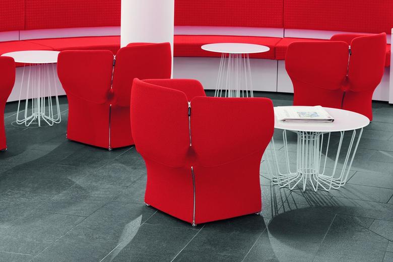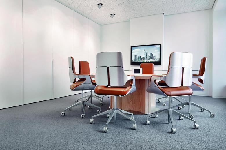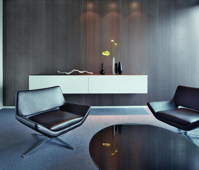 Besonderes Augenmerk liegt auf der flexiblen Nutzung des Konferenzbereichs. In der Mandantenlounge laden lederbezogene Drehsessel in Verhandlungspausen zum vertraulichen Gespräch ein. Mit wenigen Handgriffen lassen sich diese wegschieben und mobile Trennwände verschwinden in einem eigens dafür gebauten Schrank. Es entsteht eine Aula für Vortragesveranstaltungen mit bis zu 100 Personen.