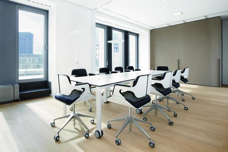 Im 7. Obergeschoss befinden sich Empfang und Konferenzetage. Hochwertige Materialien und helle, der Natur entlehnte Farbtöne unterstreichen den zeitgenössisch gediegenen Stil, in dem sich die Kanzlei präsentiert. Leicht schräg im Raum steht der fünfeinhalb Meter lange weiße Empfangstresen. Ihm gegenüber weist eine Wand aus verschiedenfarbigen stoffbespannten Akusik-Paneelen den Weg zu den Konferenzräumen.