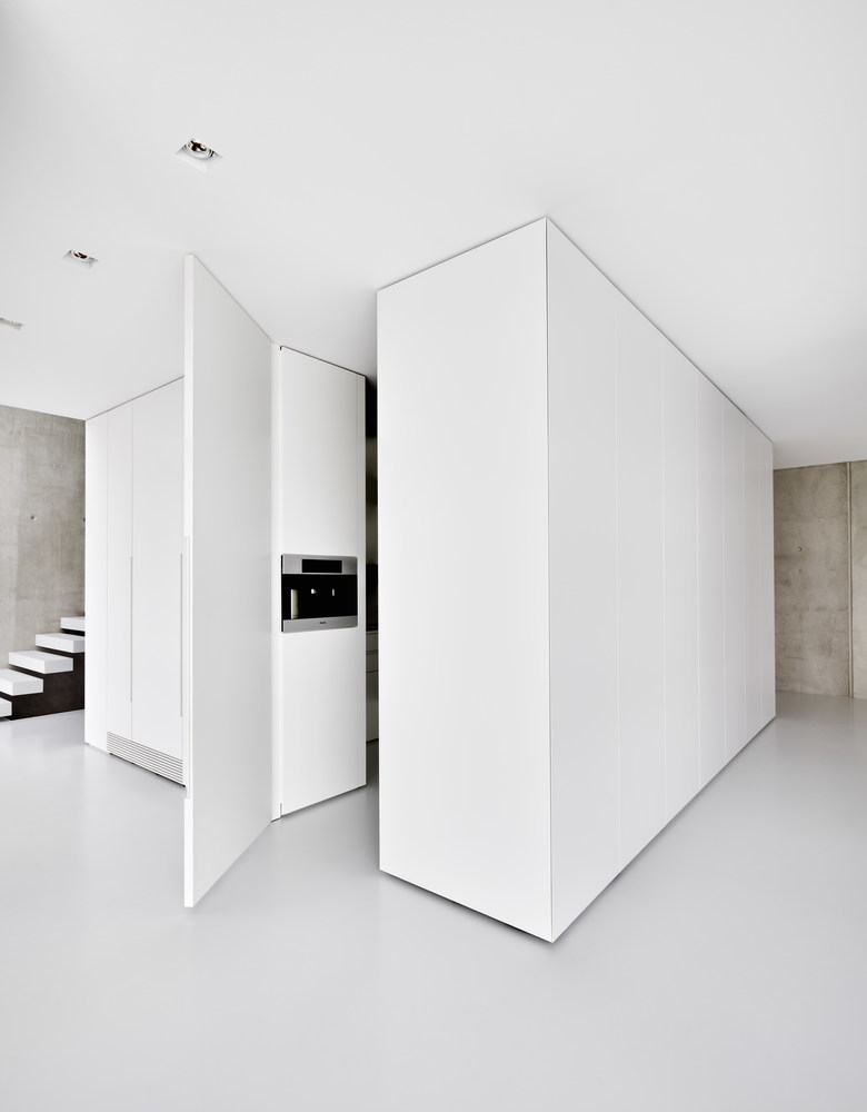 Dabei steht bei der Planung weniger das Sichtbare im Blickpunkt, als das was verborgen ist. So ist zum Beispiel die Kochinsel gleichzeitig Frühstücksplatz. Hinter glatten Lackfronten lässt sich zu beiden Seiten eine Sitzbänke aus ihrem Rumpf herausfahren. Der geschlossene Kubus wirkt von außen unauffällig. Eingefräste Grifffugen verraten, dass sich hinter der ruhigen Front noch mehr verbirgt. Mit einer zweiten Küche, einer Garderobe und einem WC greifen hier komplexe Räumgefüge ineinander.