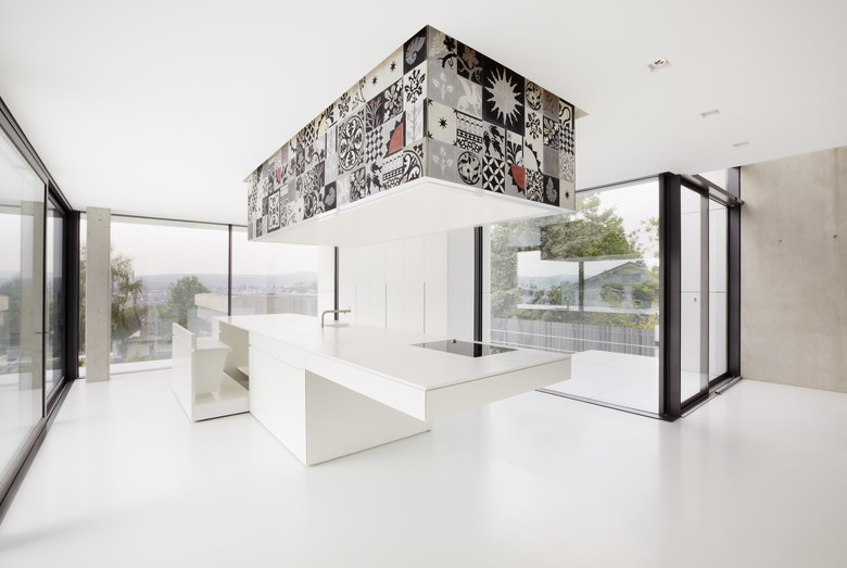 Der Blick durch die großen Fenster fällt auf den Schlossberg, weiter unten liegt der Ort. Ansonsten viel Weiß - Fußboden, Möbel, Decke, alles ist weiß. Neben dem Eingang nimmt die Kochinsel einen prominenten Platz ein. Direkt dahinter steht mitten im Raum ein weiß lackierter Kubus. Was jedoch wirklich ins Auge sticht ist das Deckenelement über der Kochinsel. Es ist ein in Zement gegossenes Sammelsurium an marokkanischen Ornamenten, das mit seiner Umbebung in Wechselbeziehung tritt. So kommen das technisch anmutende Weiß und die verspielten handgearbeiteten Fliesen erst durch die Gegenwart des anderen zur Geltung.