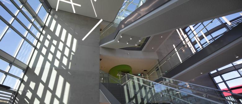 Gemeinschaftlich genutzte Bereiche wie Seminar- und Aufenthaltsräume, Treppenhäuser und Aufzüge werden von der zentralen Eingangshalle erschlossen.