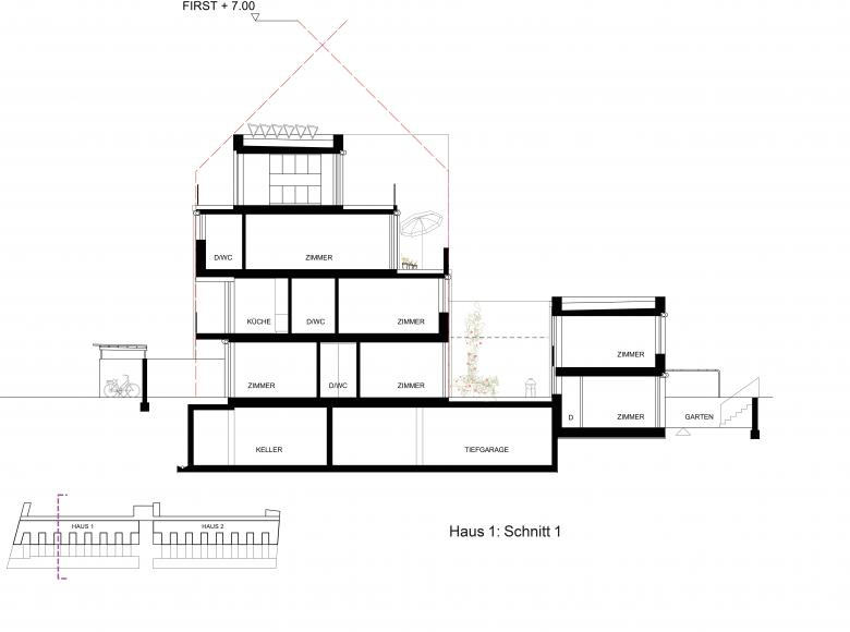 Die Lage der Wohnhäuser bietet keine grandiosen Ausblicke in die Landschaft. Der Entwurf der Wohnungen richtet deshalb das Augenmerk auf eine enge Verschränkung der Innenräume mit dem eigenen privaten Aussenraum. Die Erdgeschosswohnungen erhalten einen besonders reichhaltigen Austausch mit verschiedenen Aussenräumen: ein kühler nordseitig gelegener Vorhof, ein innenliegender Patio und ein südlicher Vorgarten mit südländisch anmutender Pergola. Die Kleinwohnungen im 1. Obergeschoss verfügen über eine grosszügige Terrasse. Die 3 ½-Zimmer-Duplexwohnungen besitzen zwei abgetreppt angeordnete ‚Hofterrassen‘ und die 4 ½-Zimmer-Duplexwohnungen eine grosse, dreiseitig umschlossene Terrasse im Wohngeschoss. Die unterschiedlichen Wohnungsgrössen und Wohntypologien lassen eine bunt gemischte Bewohnerschaft erwarten.